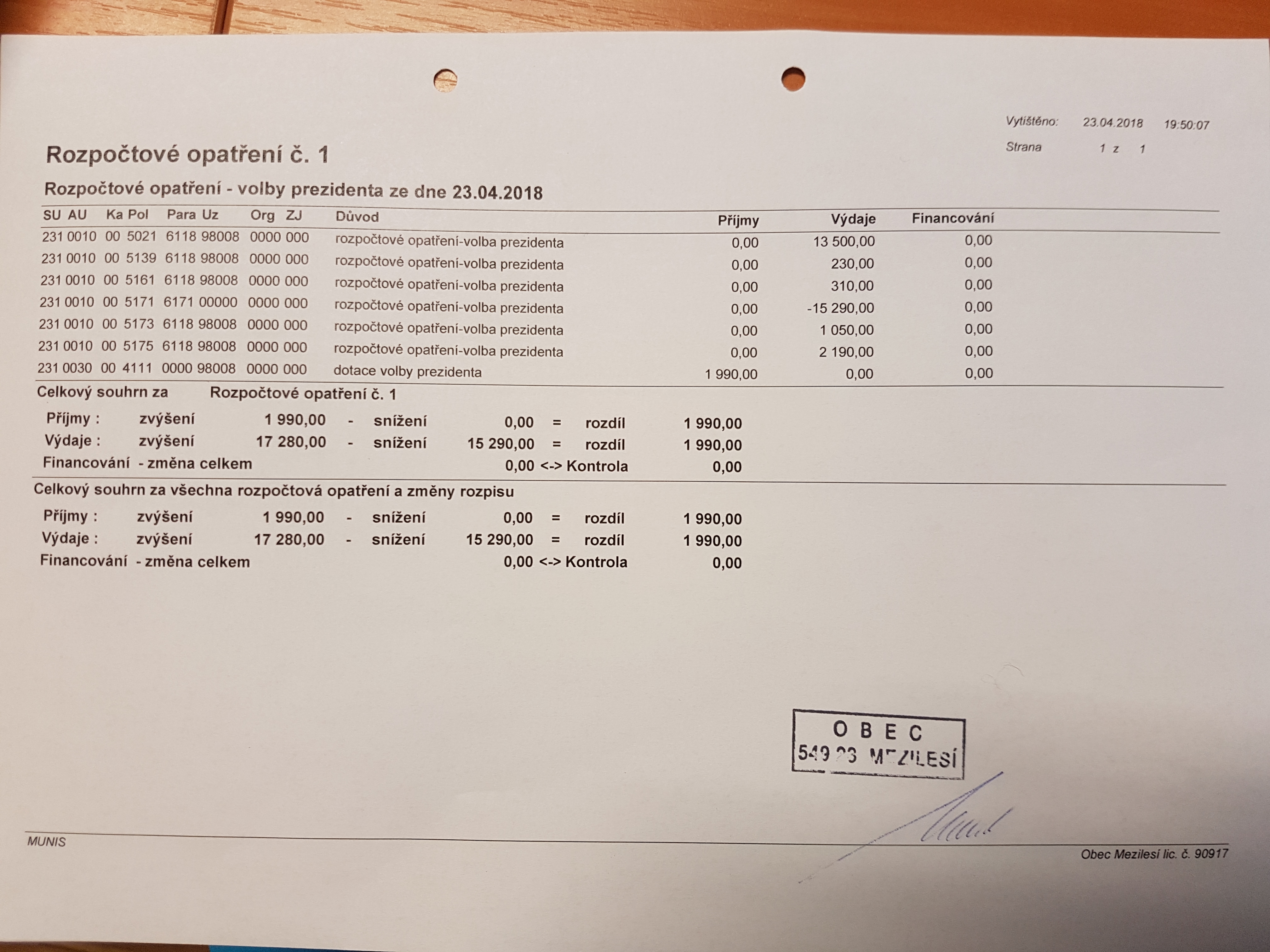 Rozpočtové opatření č.1
